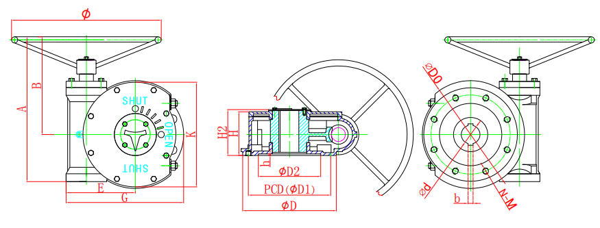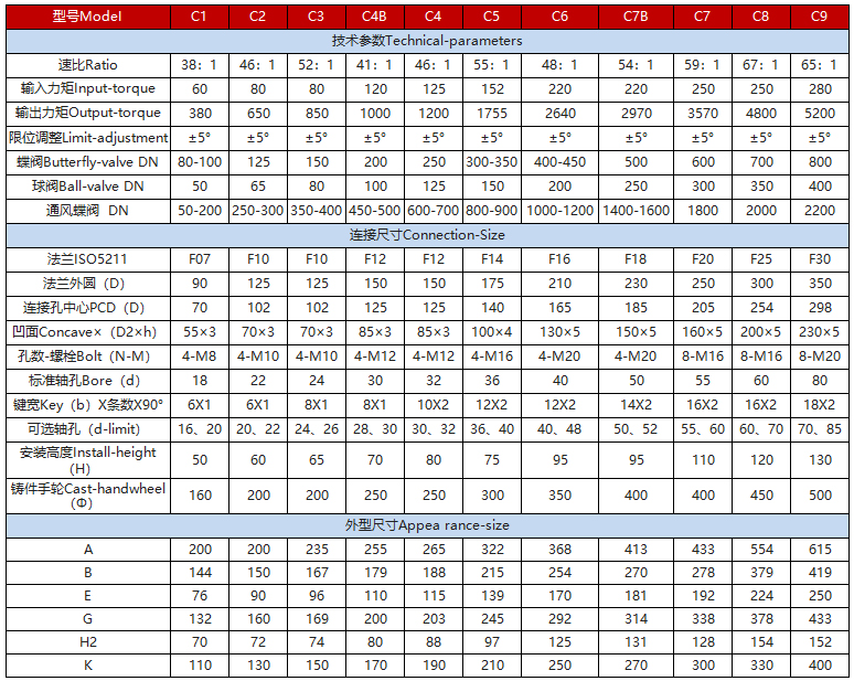 該系列蝸輪箱適用環(huán)境廣、功能全面、形式多樣(有手輪式、手輪帶鎖式、鏈輪式等),產品共有9種型號。
